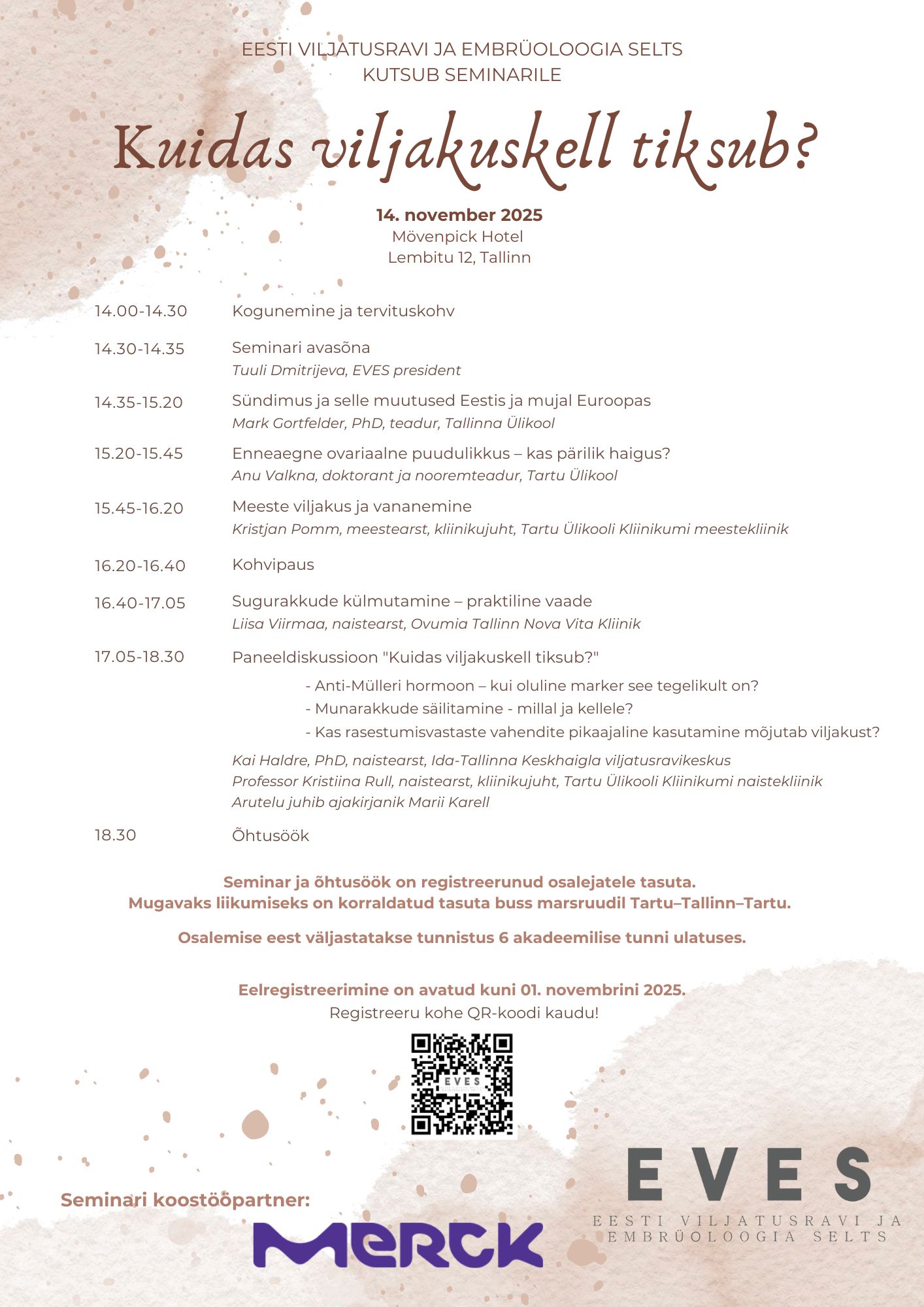 Eesti Viljatusravi ja Embrüoloogia Seltsi Sügisseminar 2025 toimub 14. novembril 2025, Tallinnas Mövenpick Hotellis (Lembitu 12, Tallinn), algusega kell 14:30.