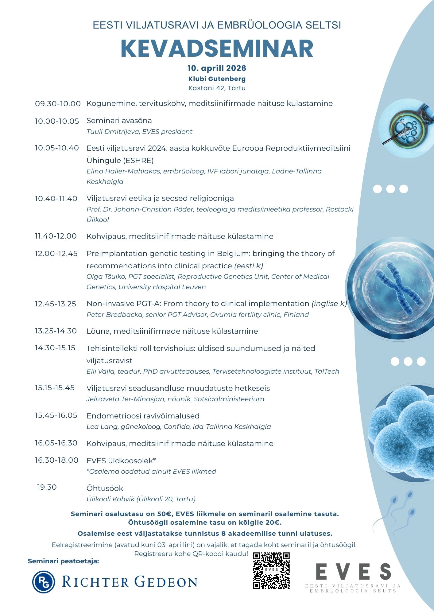 Eesti Viljatusravi ja Embrüoloogia Selts kutsub seminarile, mis toimub 10. aprillil 2026, Tartus, algusega kell 10:00.